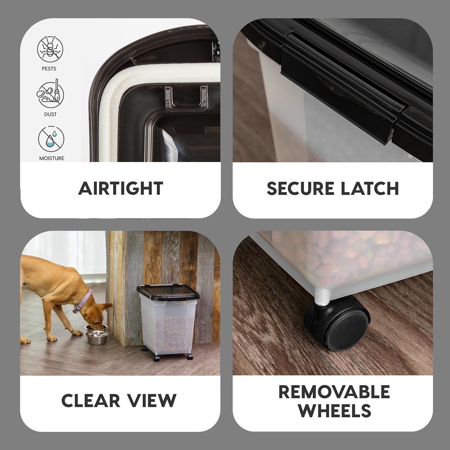 IRIS USA Airtight Dog Food Storage Container, WeatherPro, Up to 25 lbs, Removable Wheels, for Dog Cat Bird and Other Pet Food Storage Bin, Keep Fresh, Translucent Body, Made in USA, Clear/Black