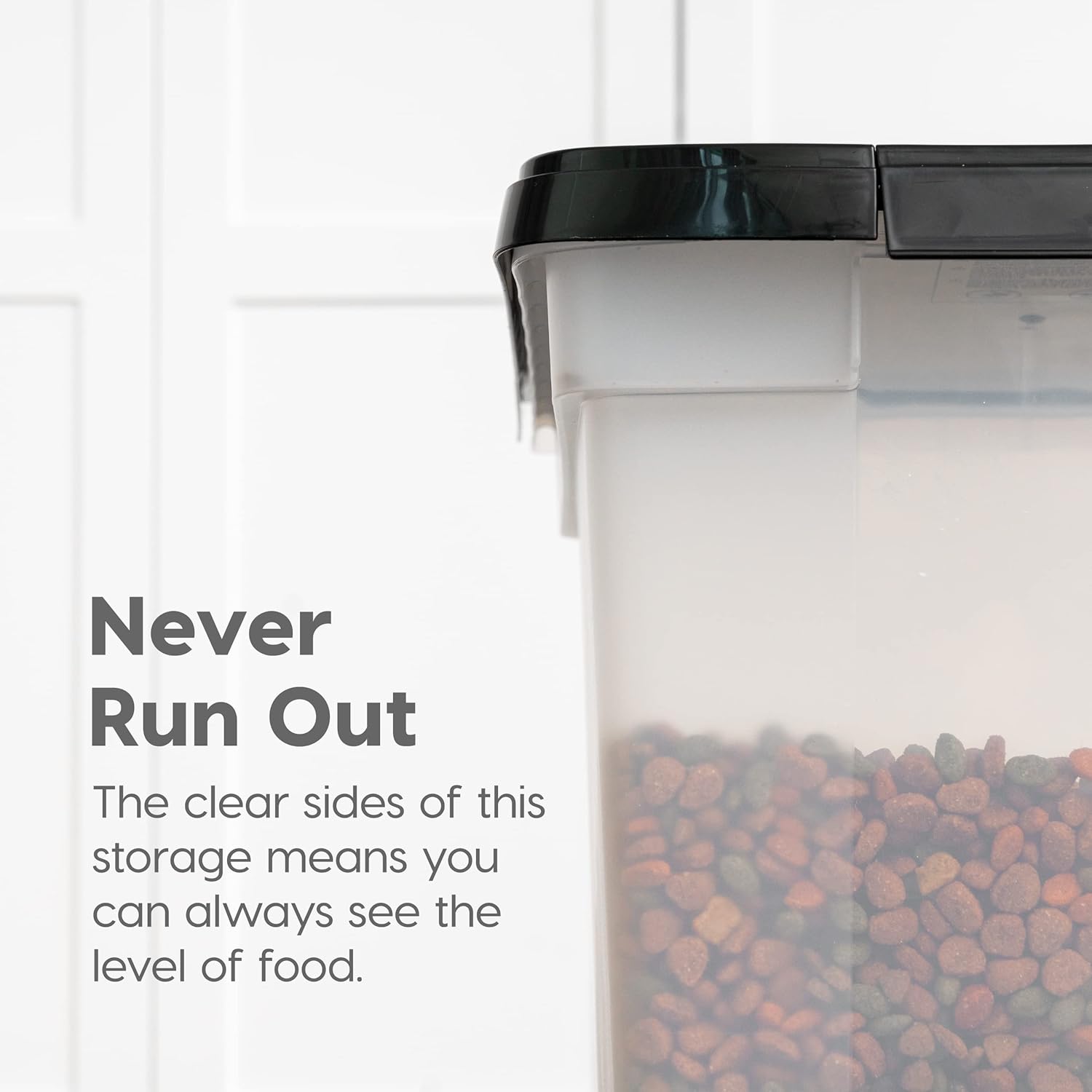 CLEAR CONTAINER BODY: The translucent body allows you to check the food level in just one glance. Quickly check the remaining amount before you head to the pet store. Designed with a wide top and secure latch for easy opening, scooping and cleaning.