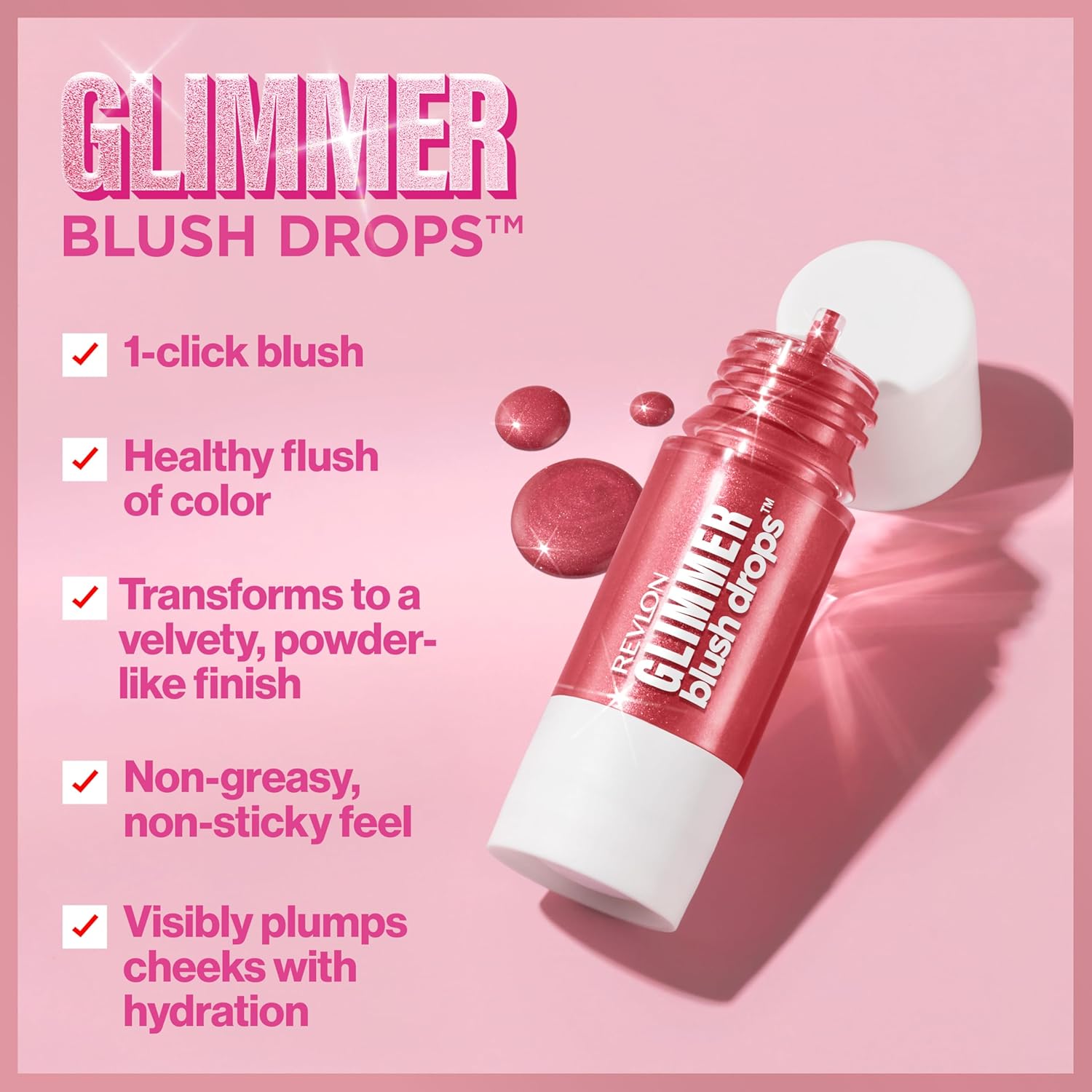 Shake, click, blend and glow. NEW Revlon Glimmer Blush Drops gives you a healthy flush of color with just one drop. No guesswork. Designed with an easy precision dropper, this 1-click blush dispenses the perfect amount of highly pigmented color. One drop is all you need for both cheeks. It blends smoothly and evenly—easily transforming from a lightweight liquid to a velvety, powder-like finish. The serum-like texture visibly plumps cheeks with hydration and provides an instant, lifted effect without any greasiness or stickiness. Formulated with Glycerin for smoother blending. Available in 3 fun, glowy shades.