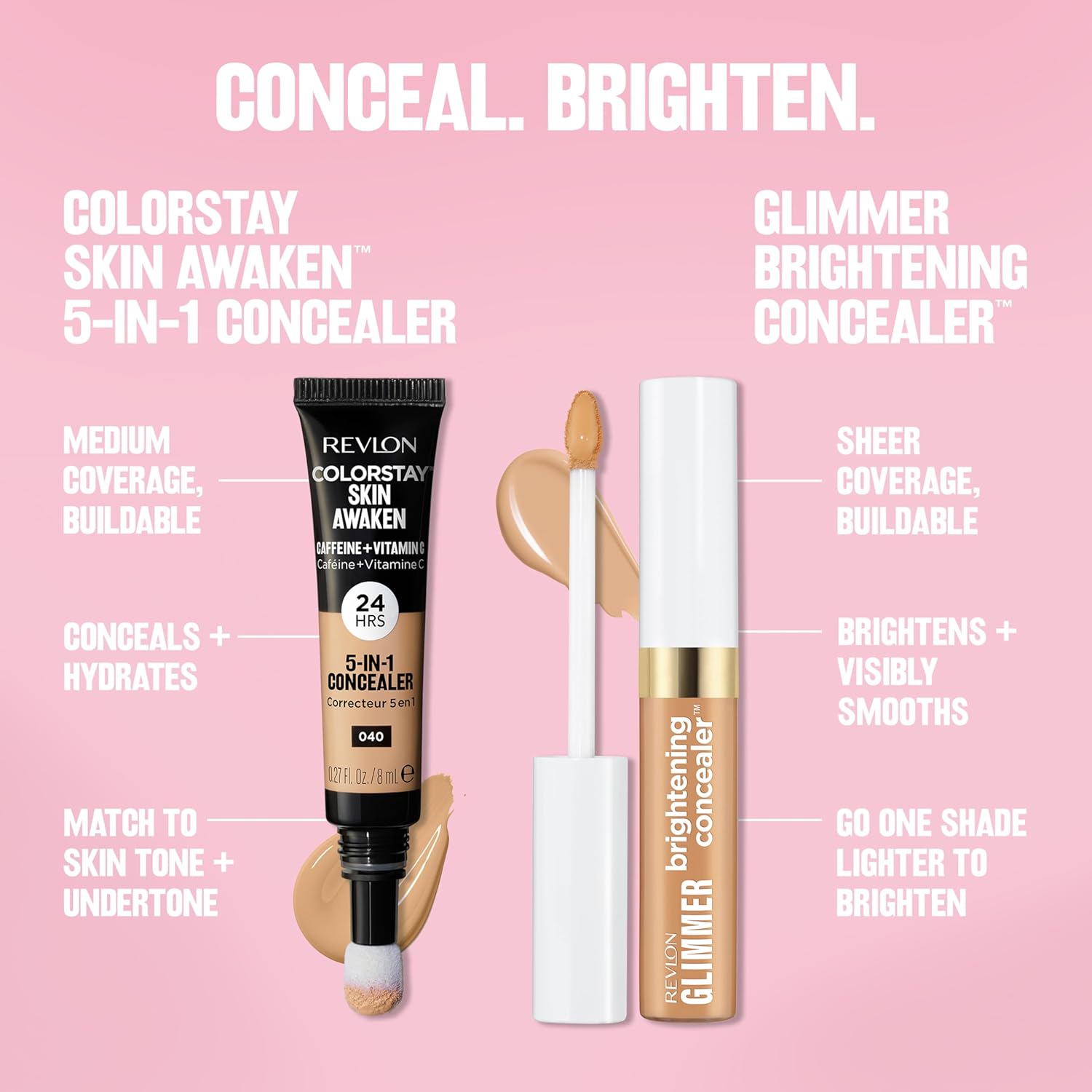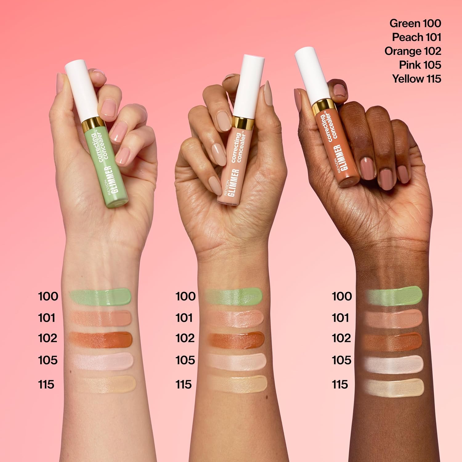 Revlon Glimmer Correcting Concealer™ instantly color corrects and conceals discolorations on the face. It can be used on any imperfection, like dark circles under the eyes, outer corners of the mouth, corners of the nose, and blemish spots. The ultra-lightweight formula moves with your skin and helps create a flawless appearance. Wears comfortably for up to 24HRS. Doesn’t settle into fine lines, wrinkles or pores. The formula helps visibly smooth fine, dry lines over time and even helps to prevent new fine lines from forming. Shades work to address different imperfections across various skin tones. Available in 5 color correcting shades: 100: Green to neutralize redness 101: Peach to neutralize dark circles and discolorations on lighter skin tones 102: Orange to neutralize dark circles and discolorations on darker skin tones 105: Pink to combat sallow skin 115: Yellow to cover under-eye circles and purple tones