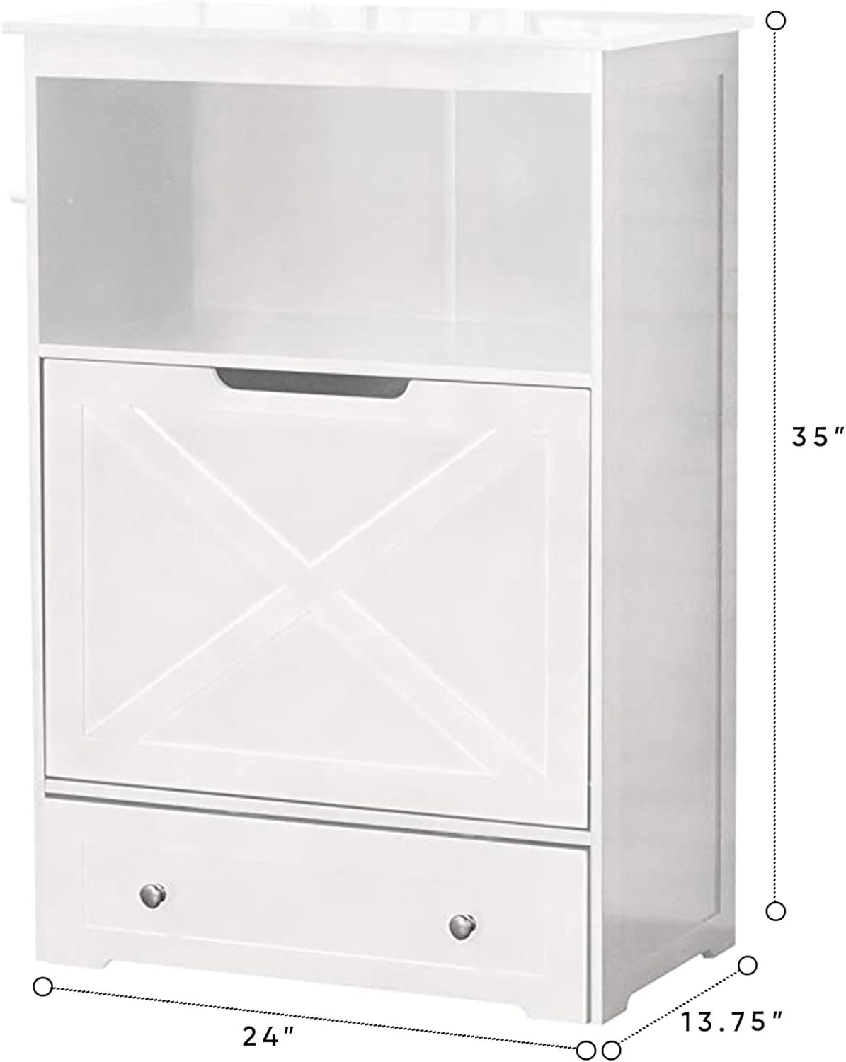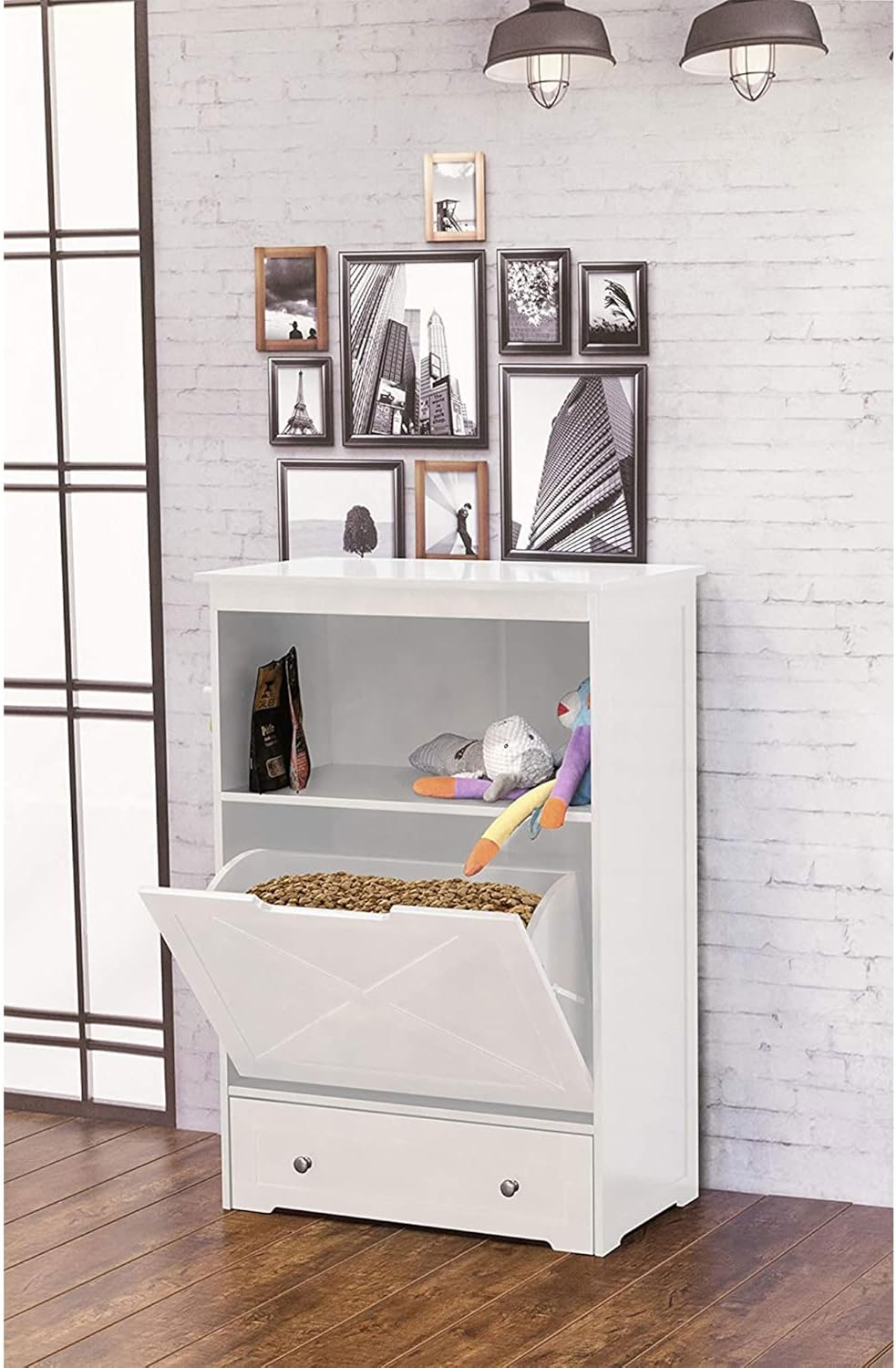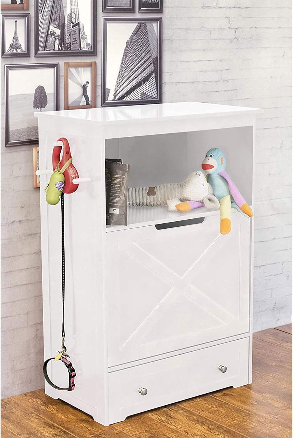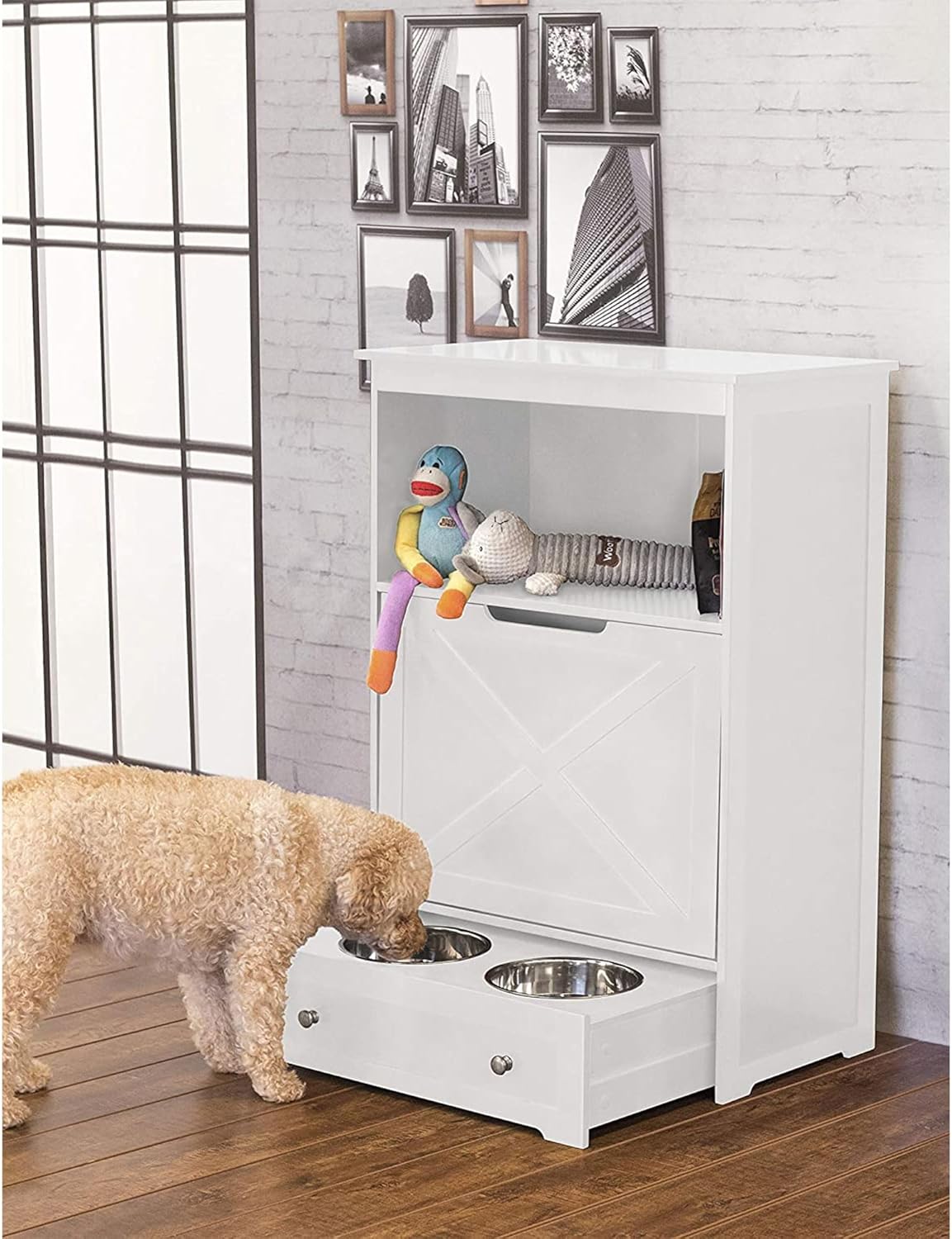 Color: White This all-in-one feeder station is the perfect addition to a house with pets. The X-panel front is very stylish and is sure to get you and your furry friend many compliments. The bottom features a pull-out drawer with two stainless steel bowls that can be easily removed for cleaning. Sitting just above, is a folding trough for extra food, making scooping out your pet’s meals a breeze. The top shelf provides additional storage for a variety of items, ranging from chew toys to books. To top it all off, three pegs have been mounted to one side of the unit for hanging scoops, leashes or any other accessories for your pet. Made entirely from MDF with a durable painted finish, this piece is sure to grace your home for a long time.