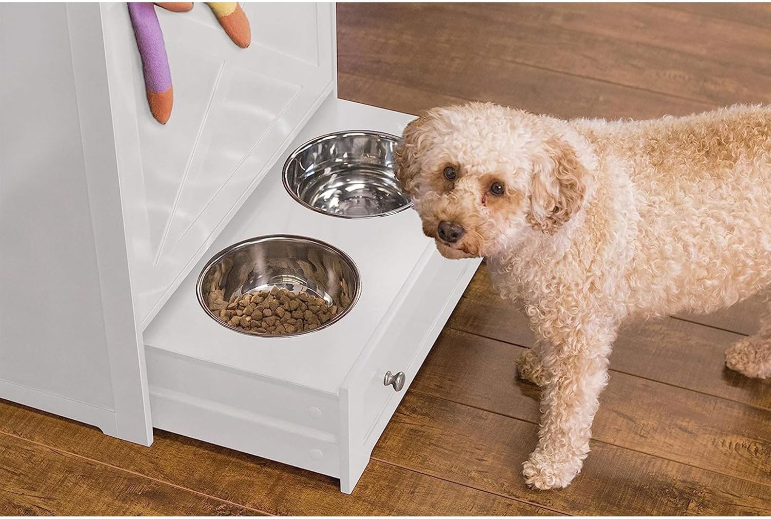 Dog Feeder Stand: Food bowl stand with two dish storage pull-out drawer on bottom (removable dishes)